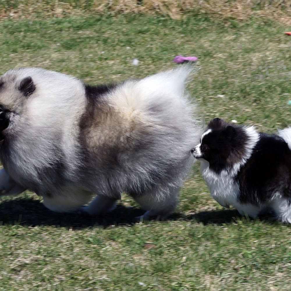 While over the years I have always had a Pomeranian as part of my “pack”, in 2011 parti-color Poms became a new adventure in breeding and showing. These little dogs with BIG attitudes live happily running in my pack of Kees.